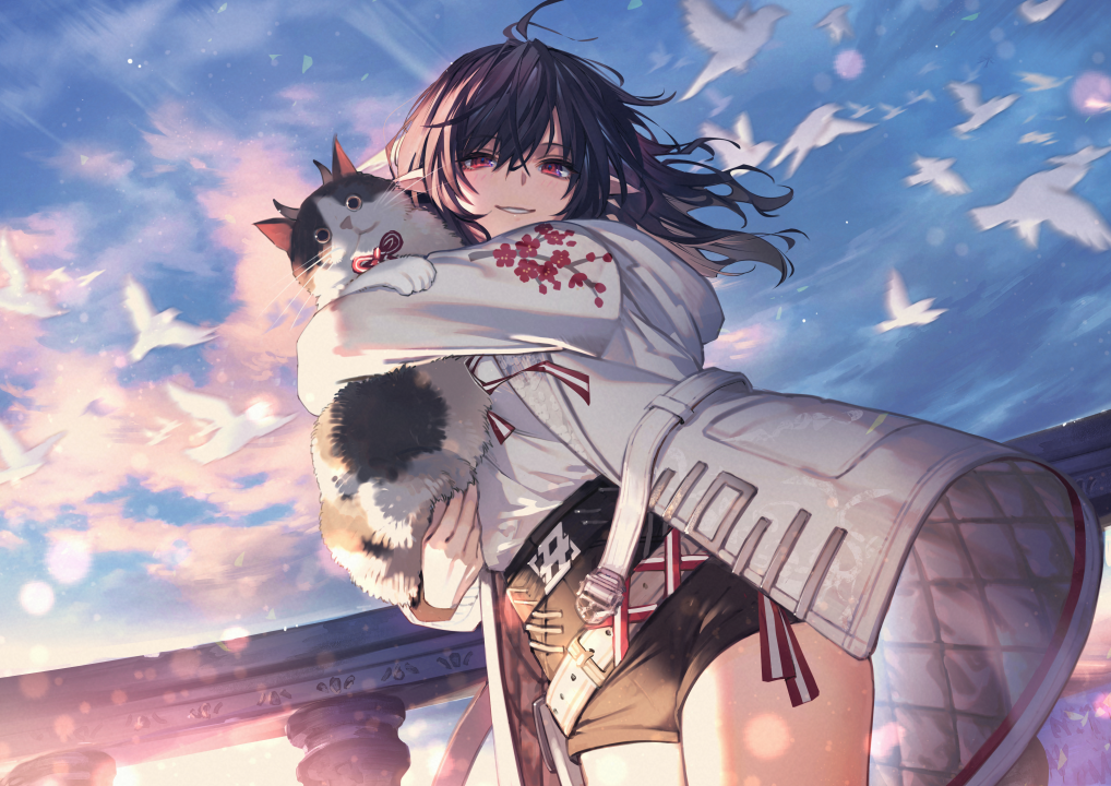 猫女、黑发、红眼、微笑、长发、大腿、猫、动漫女孩、日落、夕阳、天空、云、鸟、动物、阳光、短裤
