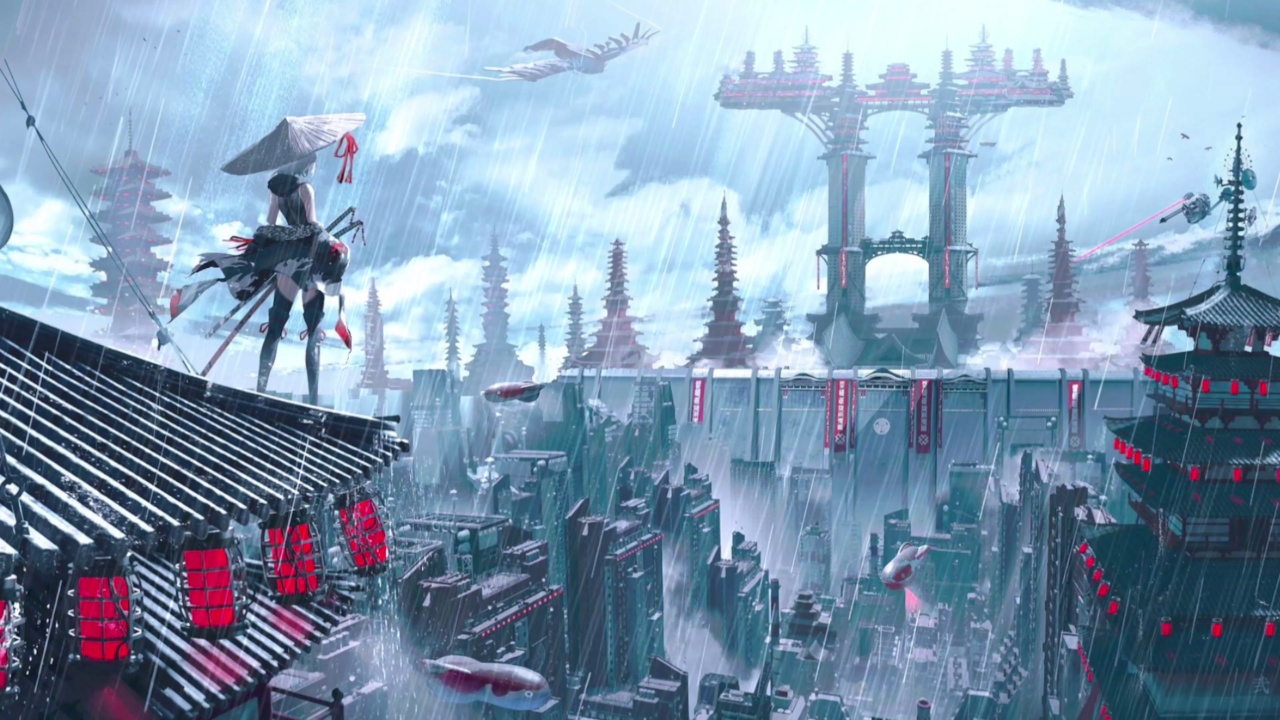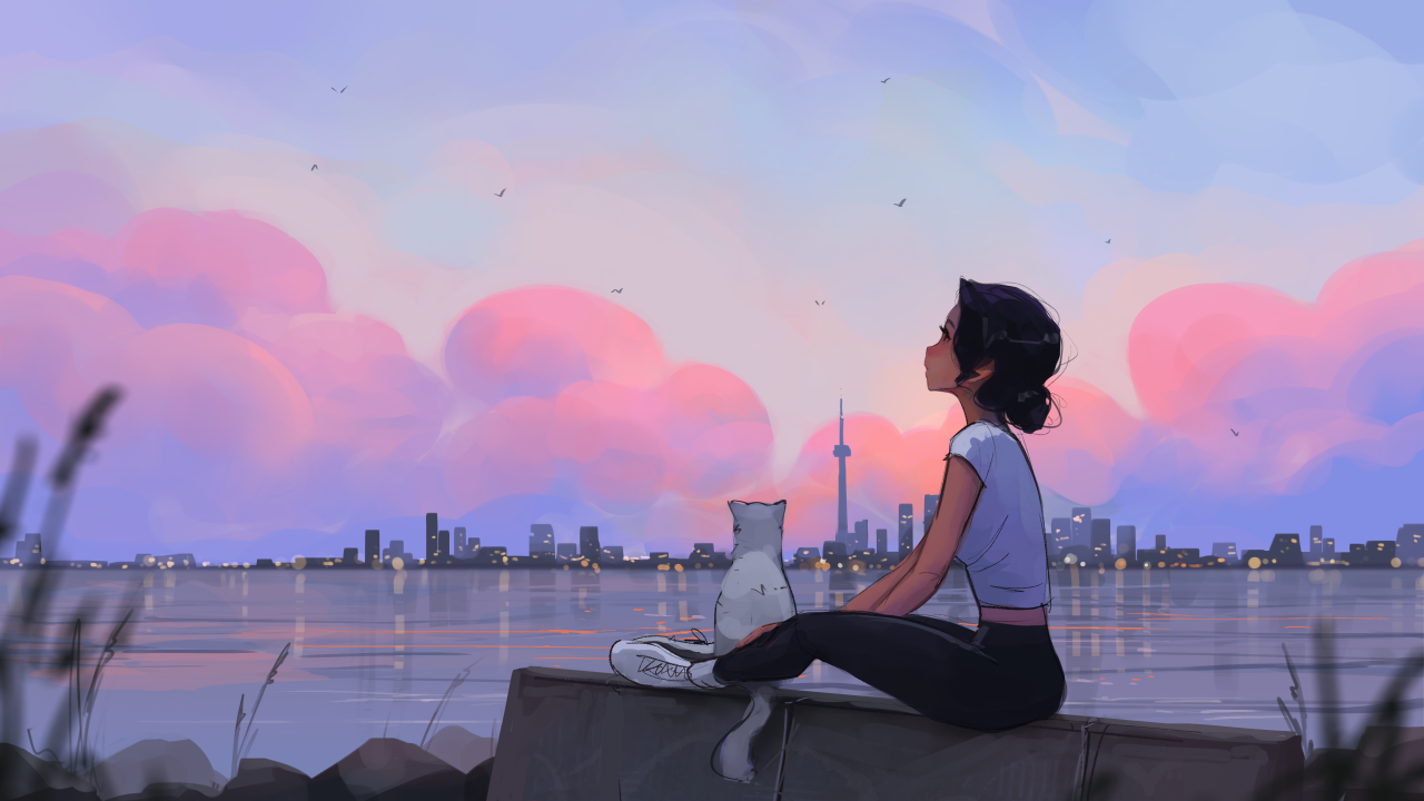 女孩、女人、云、猫、湖、暮色、天空、水、城市、动物、建筑、鞋子、城市灯光、AI艺术