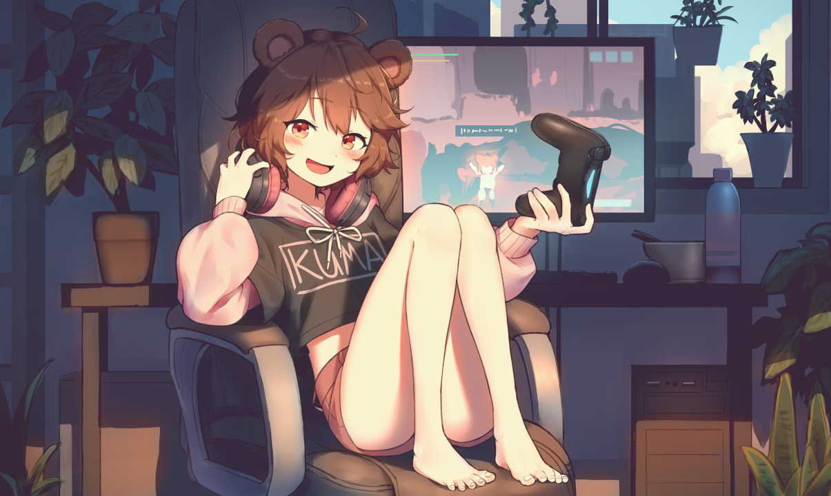 娇小、肚皮、红眼睛、坐着、赤脚、微笑、脚、动漫、女孩、AI艺术、图片、萝莉、耳机、控制器、树叶、扶手椅、游戏手柄、手柄