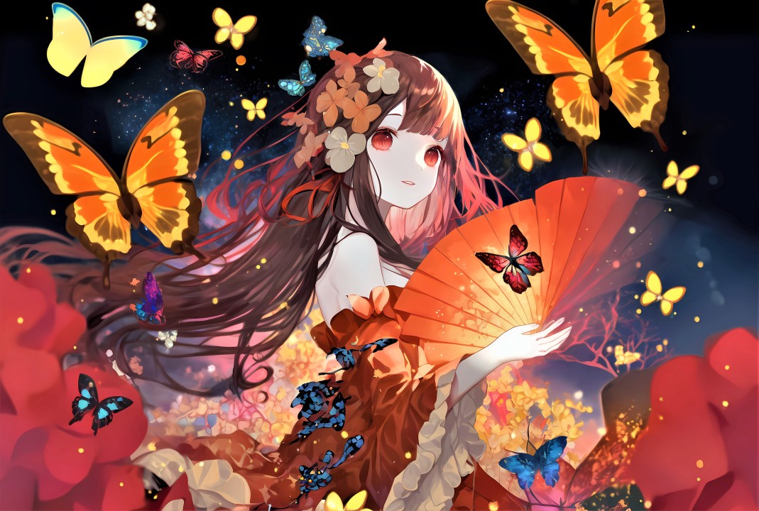 可爱的、蝴蝶、粉色、红色、动漫女孩、二次元