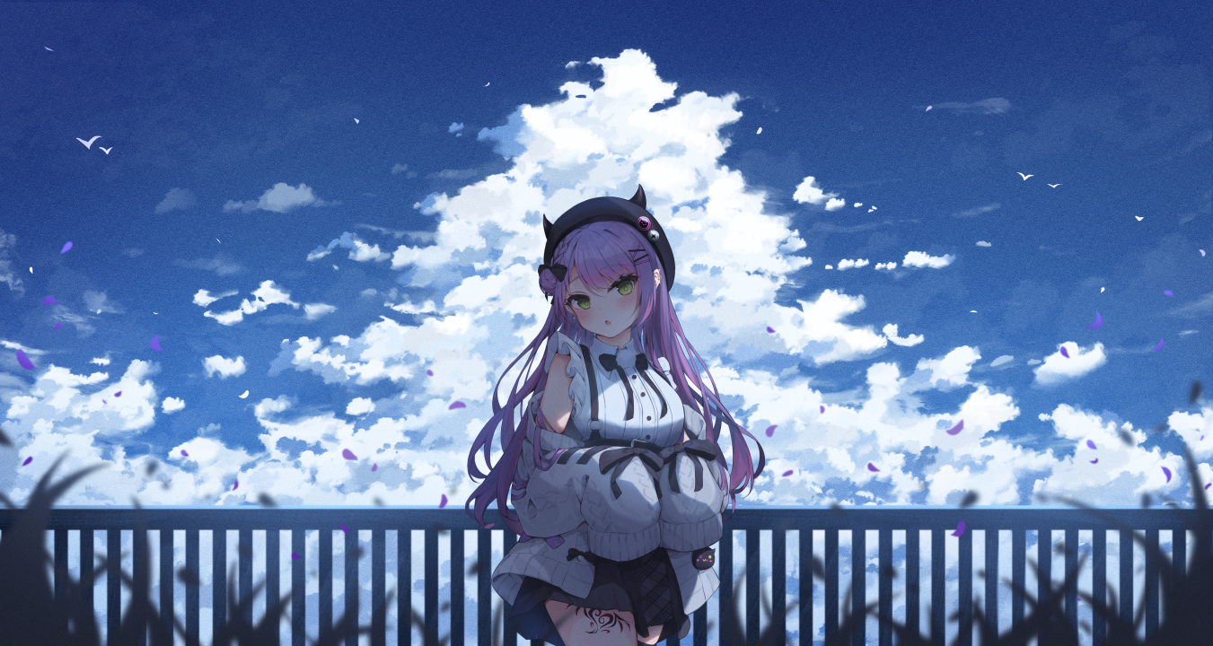 户外、绿色眼睛、紫色头发、长发、墨水女孩、妇女、帽子、动漫、云、女孩、天空、裙子、虚拟