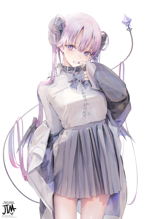 紫色头发、吉玛、动漫、女孩、紫色眼睛、角、领子、链子、白色背景、简单背景