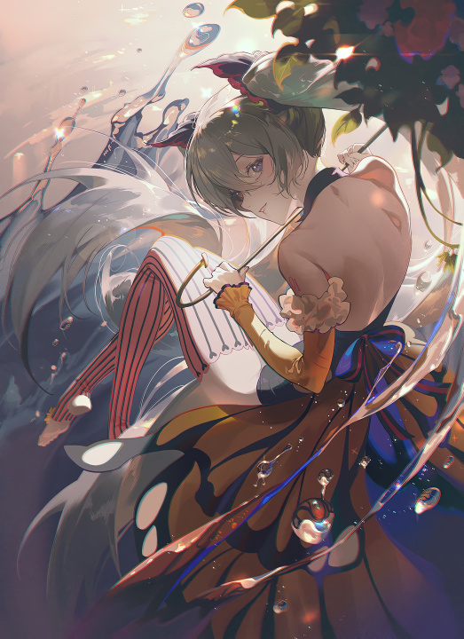 长发、初音、花、水滴、水、长袜、动漫女孩