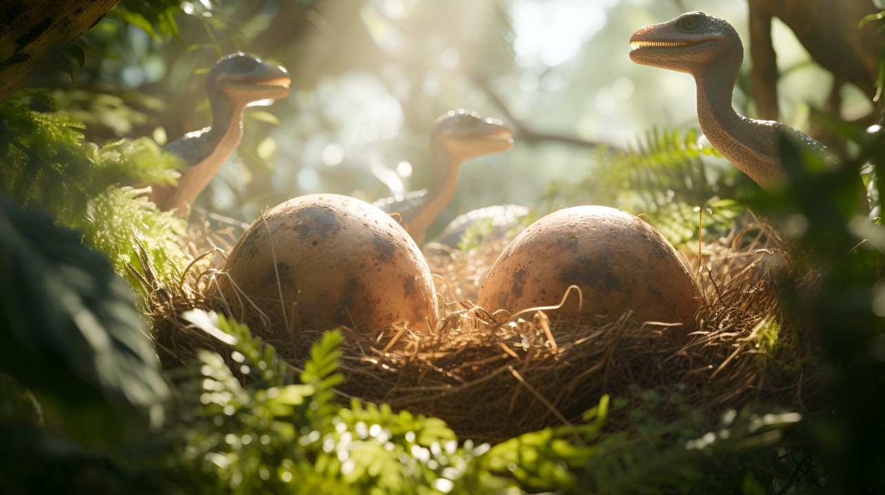 恐龙的温馨时刻:森林中的育雏景象