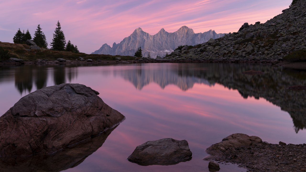 自然、风景、天空、云、山脉、岩石、树木、水、日出、粉红色