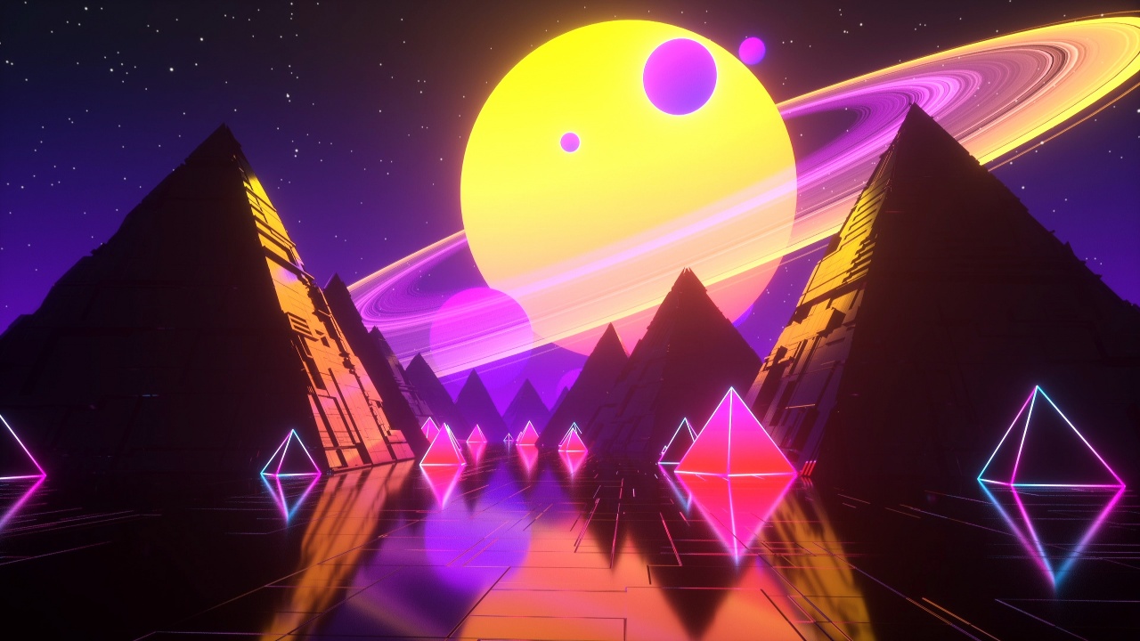 AI艺术、合成波、彩色、抽象、行星、行星环、恒星、金字塔