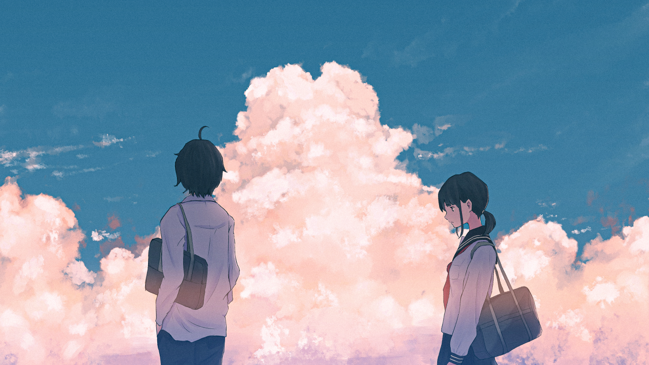 天空、雪、云、户外、动漫女孩、动漫男孩