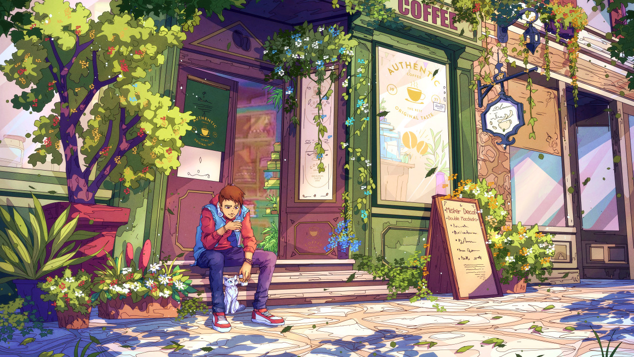 AI艺术、奇幻艺术、喵星人、咖啡、咖啡馆、耳机、植物