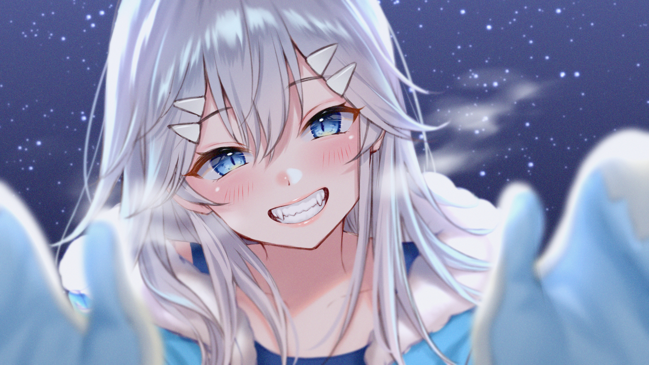 长发、蓝眼睛、微笑、脸、手套、银发、尖牙、动漫、女孩