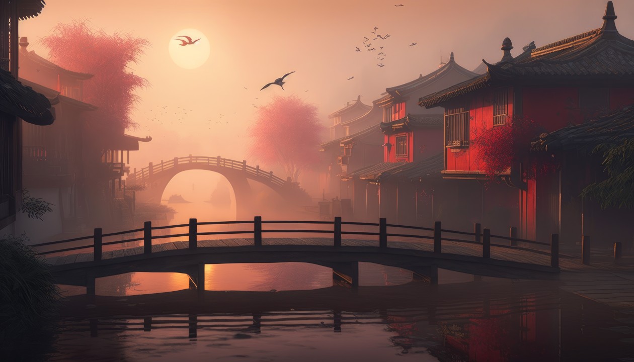 艺术、插图、桥梁、中国、村庄、太阳、鸟、水、反射