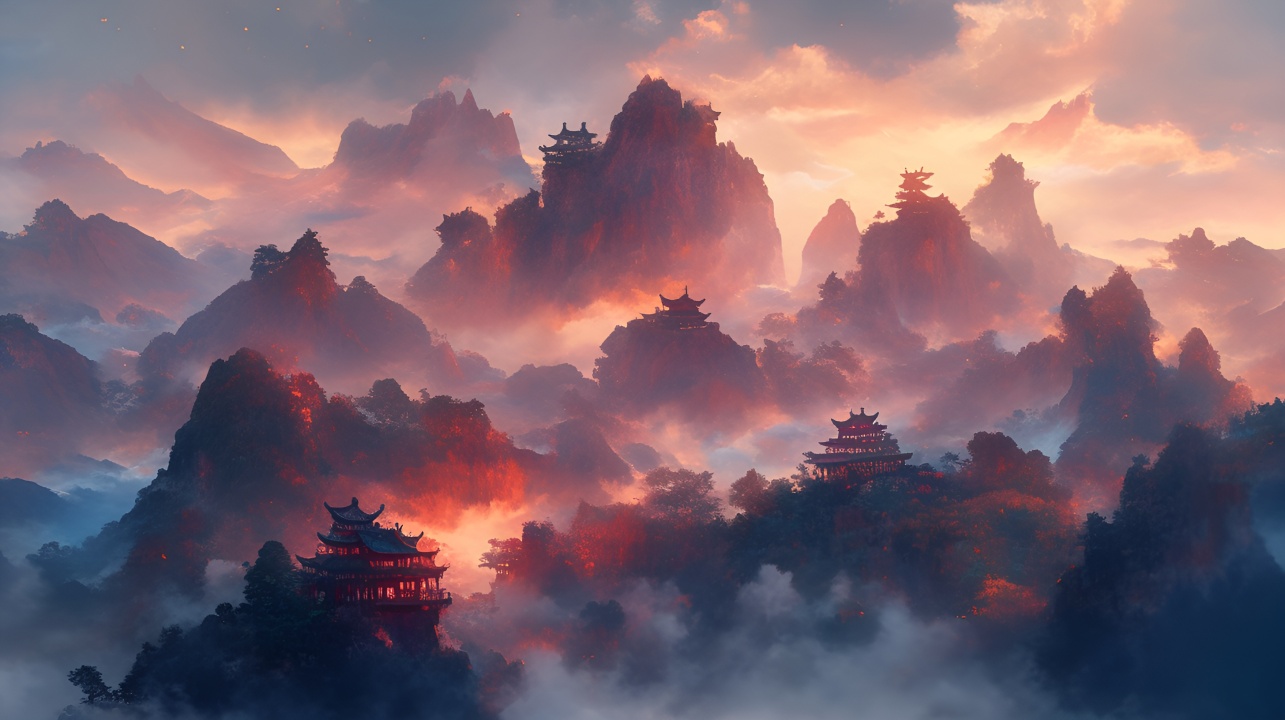 云雾缭绕的山峰与古建筑:梦幻般的仙境