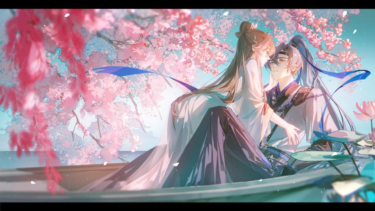 长发、马尾辫、樱花、动漫、女孩、男孩、船、树枝、花、花瓣、树叶、情侣