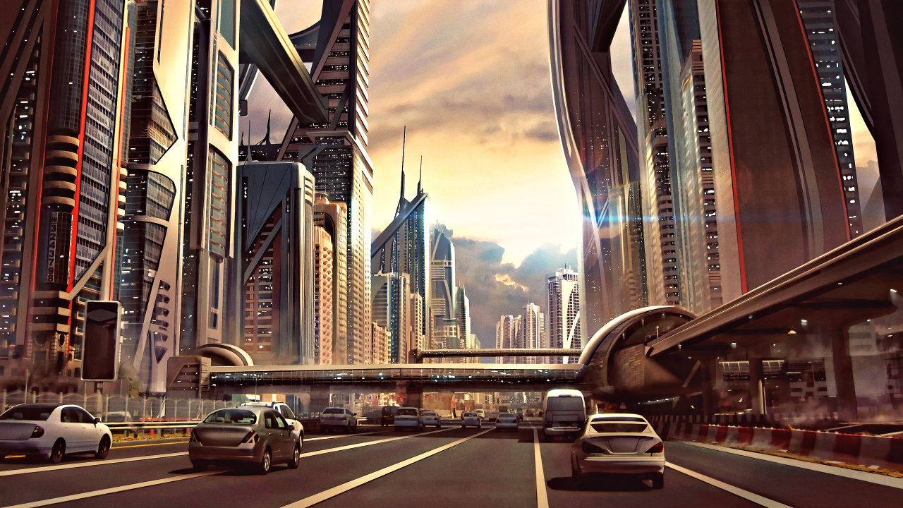 未来、城市、科幻、AI艺术、赛博朋克、汽车、交通、道路