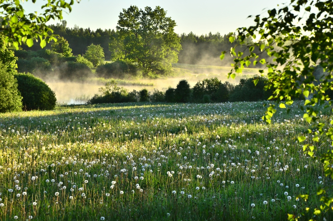 自然、蒲公英、森林、树木、河流、田野、风景、灌木