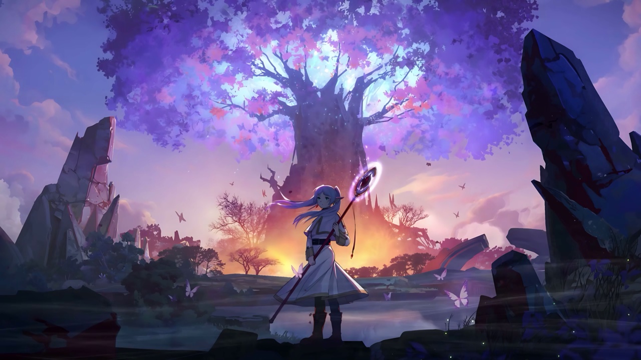长头发、白头发、蓝眼睛、动漫、女孩、植物