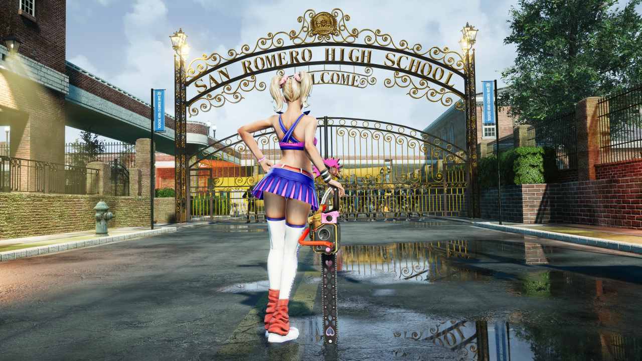 电子游戏、女孩、金发、棒棒糖、电锯、高中、水坑、啦啦队、僵尸、校车、街道、水、裙子、双胞胎、树叶、砖块、人行道、沥青、后视镜