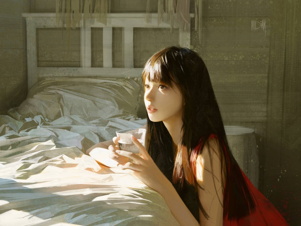 女人、长发、深色头发、亚洲人、目光远离、AI艺术、插画、绘画、床、房间、室内、阳光