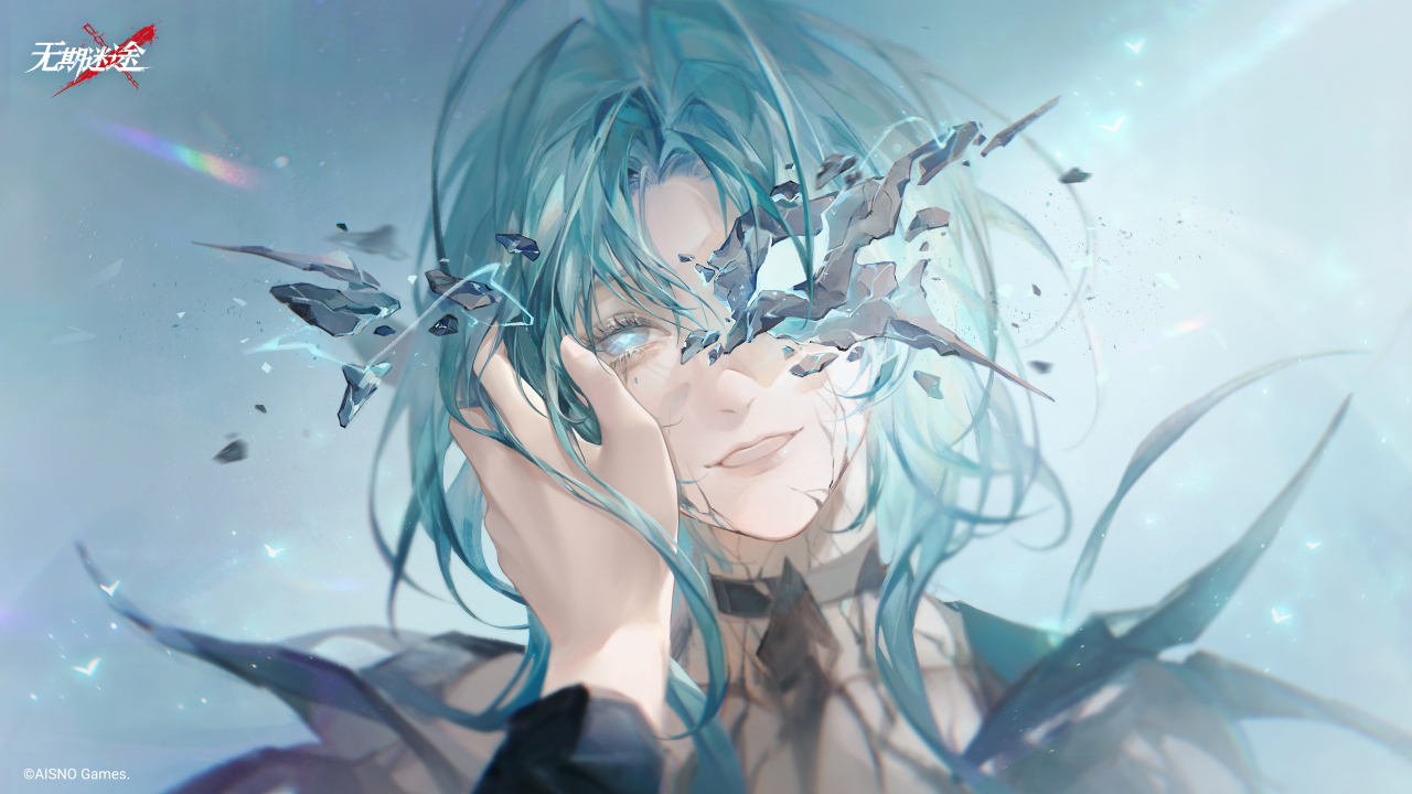 电子游戏、蓝头发、长发、微笑、游戏海报、动漫女孩、简单背景