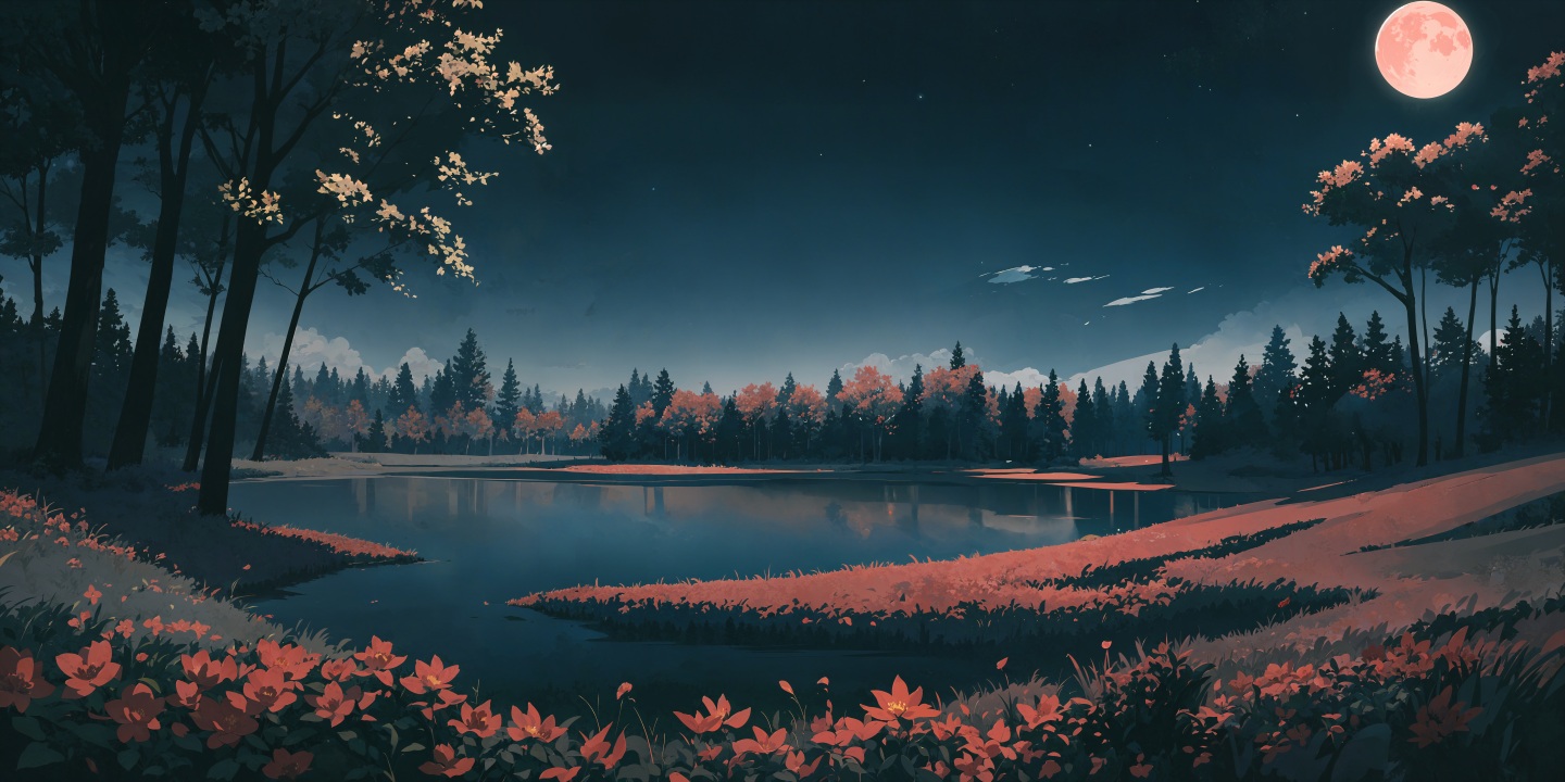 AI艺术、树木、自然、湖泊、云、艺术、水、月亮、天空、星星、花朵、草