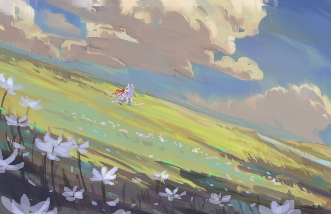 电子游戏、天马、狼、草、花、云、田野、动物、AI艺术