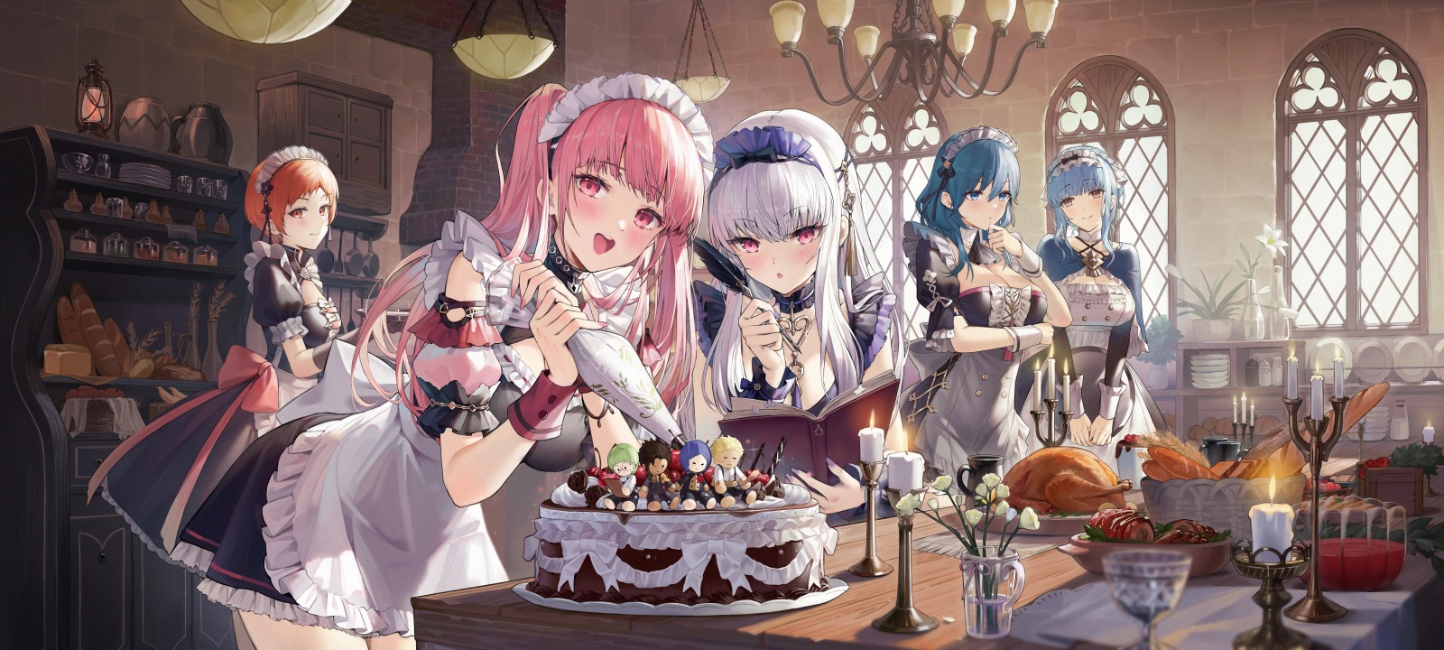 粉色头发、女人、张嘴、长发、动漫、女孩、蛋糕、食物、糖果、蜡烛、女仆装