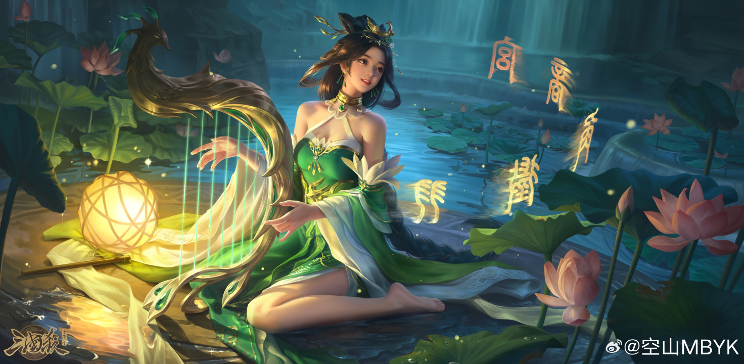 游戏CG、肩膀、赤脚、脚、长发、微笑、竖琴、乐器、水、花、耳环、游戏CG艺、国风