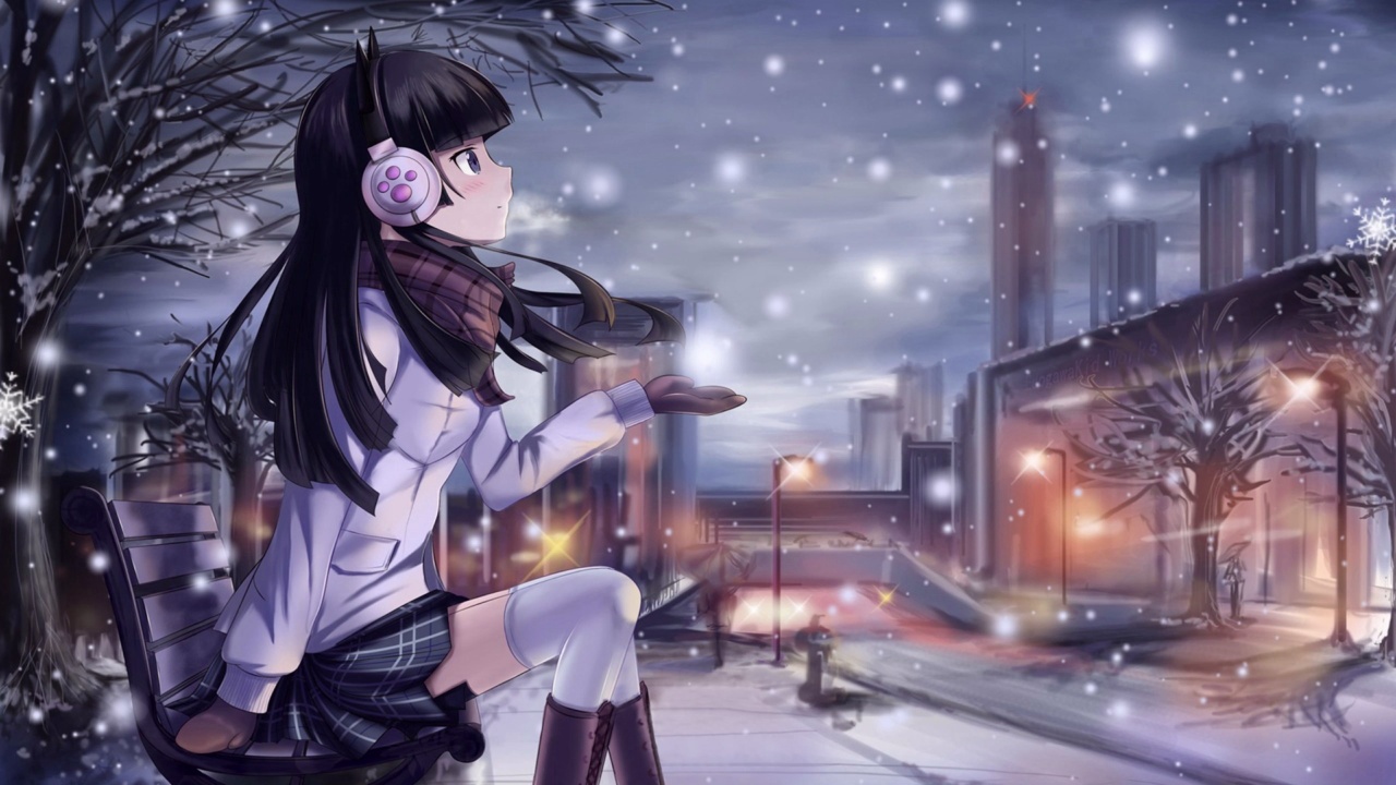 黑发、动漫、反射、鲜花、动漫女孩、连衣裙、蓝色、异瞳