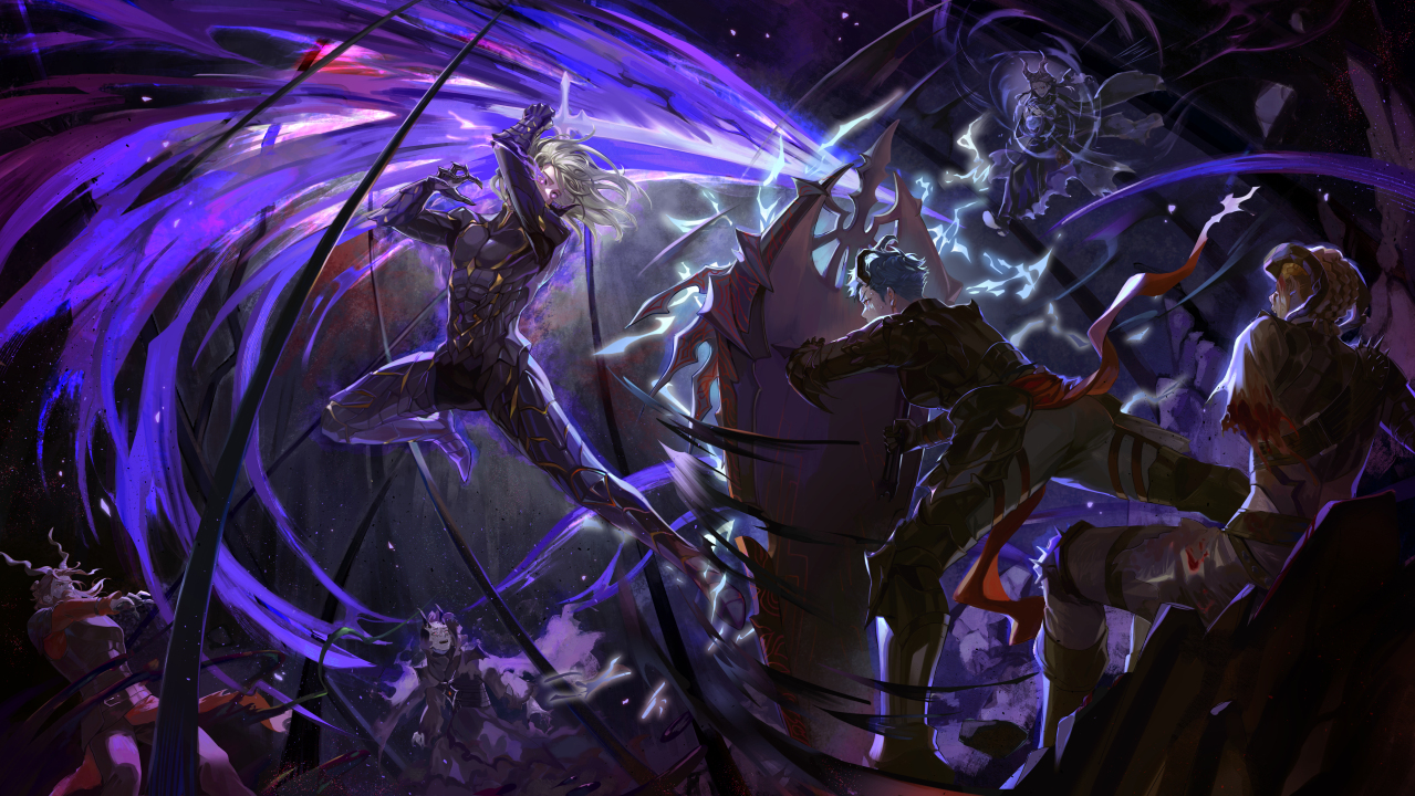 亚瑟·莱温、战斗、紫色火焰、剑客、盾牌