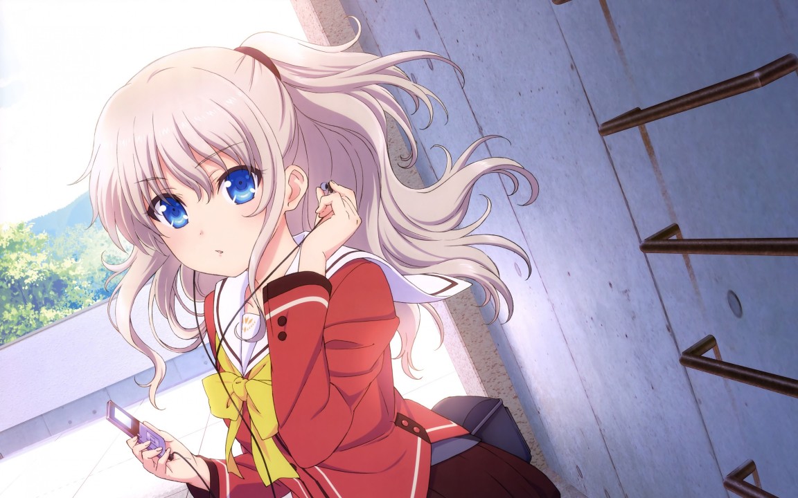 蓝眼睛、长发、户外女性、动漫女孩、动漫、校服、耳机、红色衣服