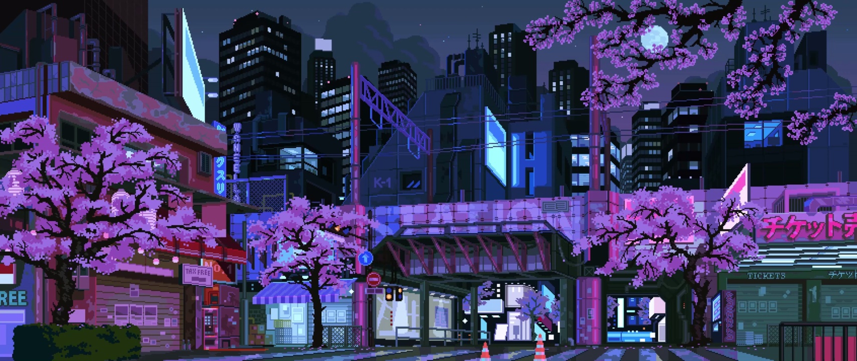 粉色、城市、赛博朋克、樱花