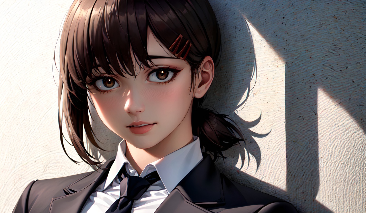 脸、黑发、领带、动漫女孩、棕色的眼睛、艺术