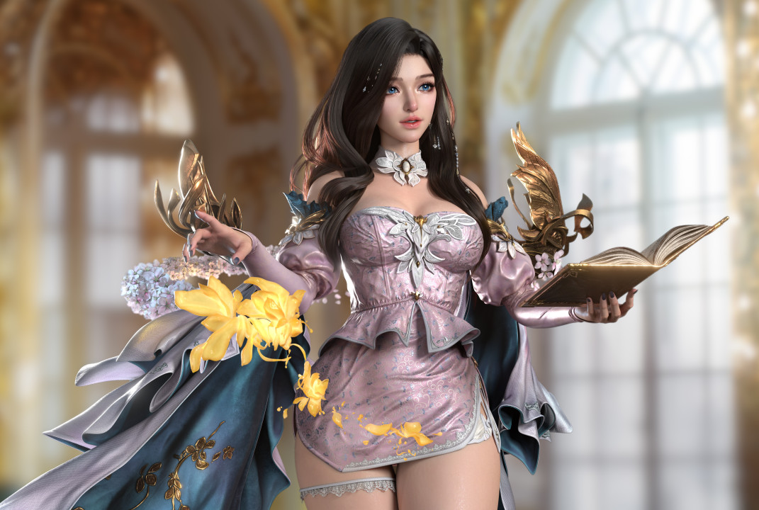 女人、深色头发、长发、人物、书籍、金色、连衣裙、粉色、室内