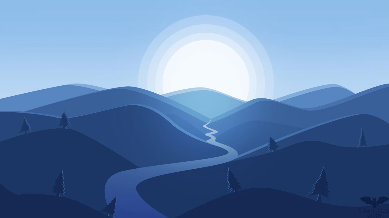 AI艺术、简单背景、太阳、光线、日出、早晨、树、山脉、风景、蓝色、蓝色背景、极简主义