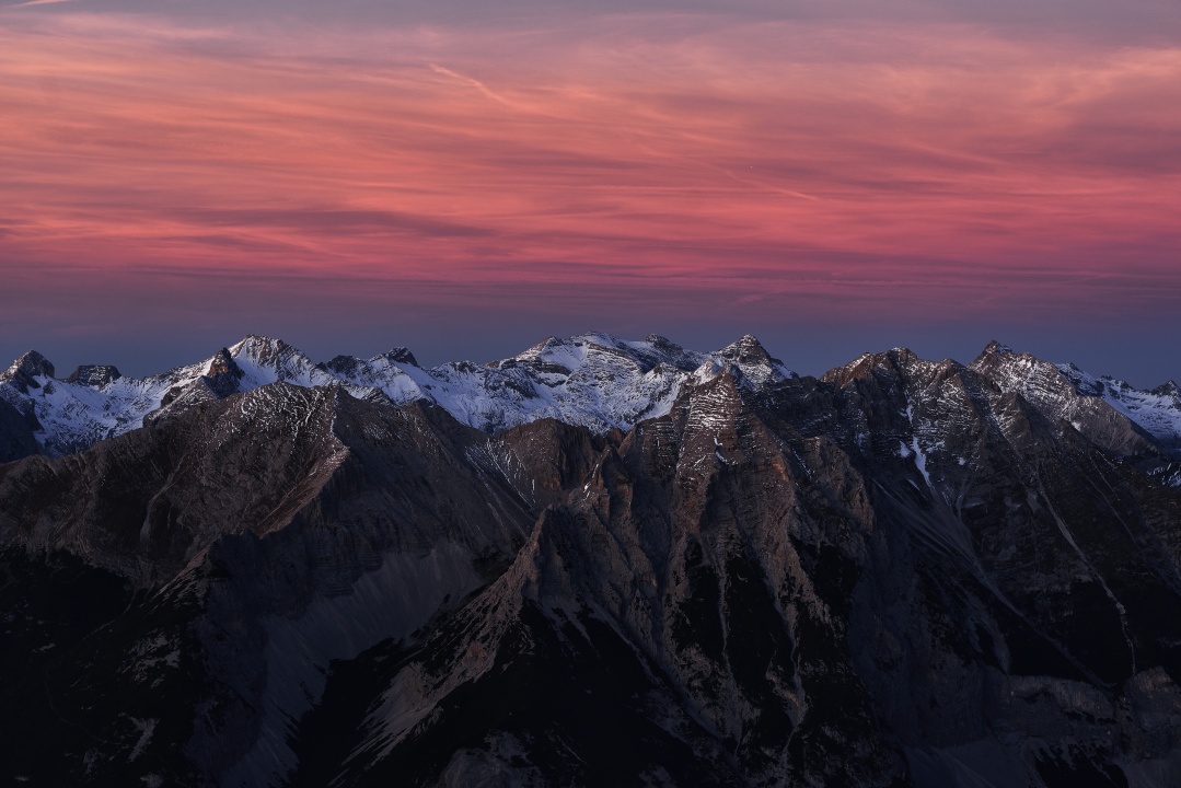 风景、山脉、天空、日落、雪峰、云彩、红天