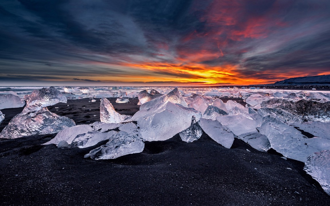 冬日海滩上的冰块与日落