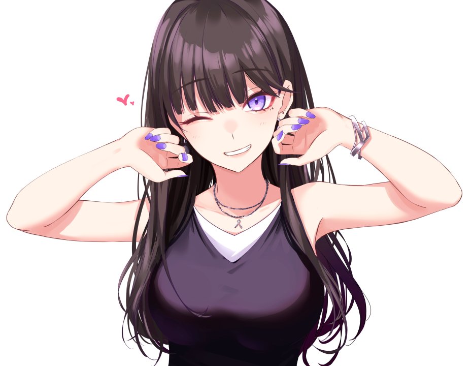 微笑、深色头发、长发、白色背景、动漫女孩、眨眼、紫色眼睛
