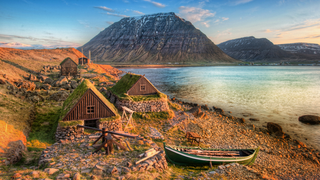 摄影、风景、冰岛、水、山脉、房子、雪景、船舶、自然、云、天空、晚霞