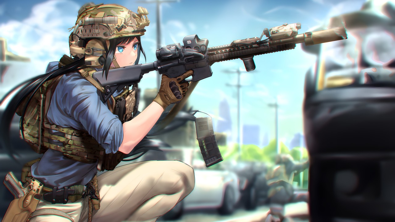 女孩、战术、动漫女孩、枪、头盔、手套