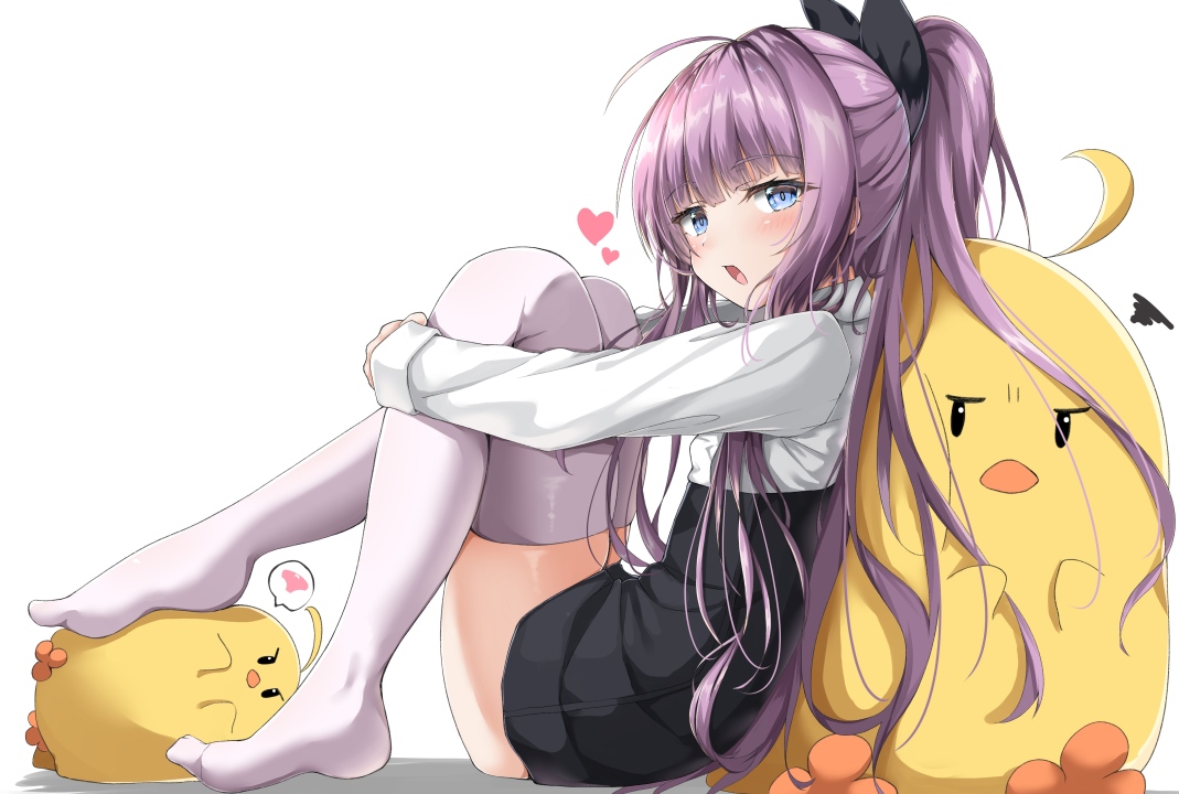 紫色的头发、长发、蓝眼睛、马尾辫、抱膝、动漫女孩