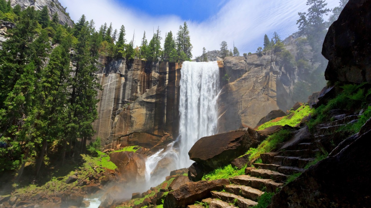 悬崖、瀑布、岩石、石阶、自然、风景