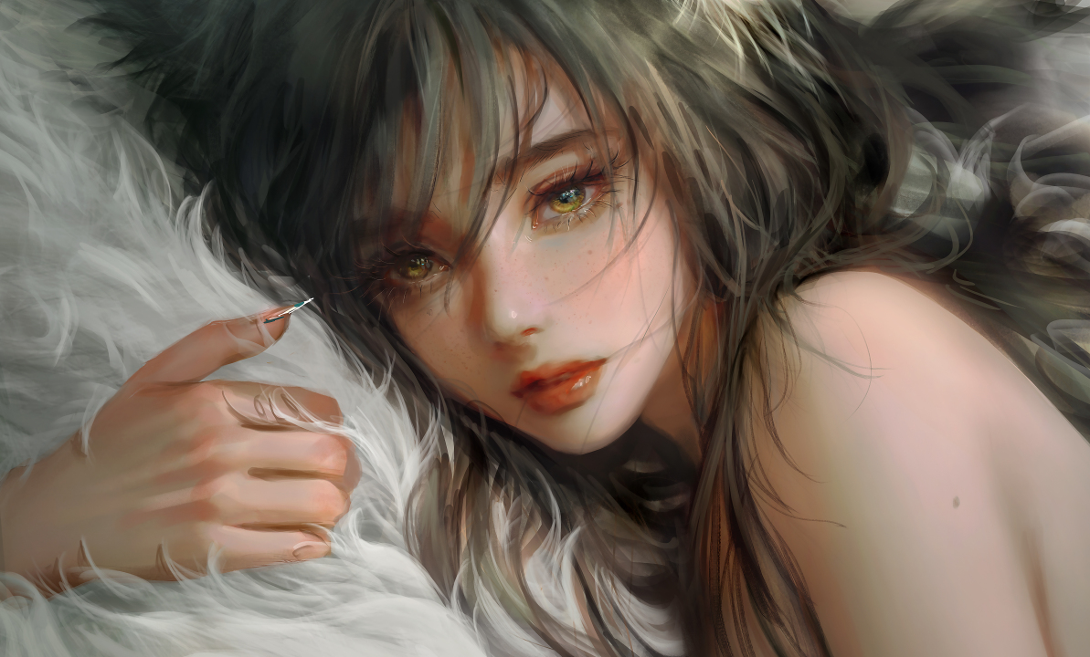 脸、长发、深色、女人、特写、肖像、红色口红