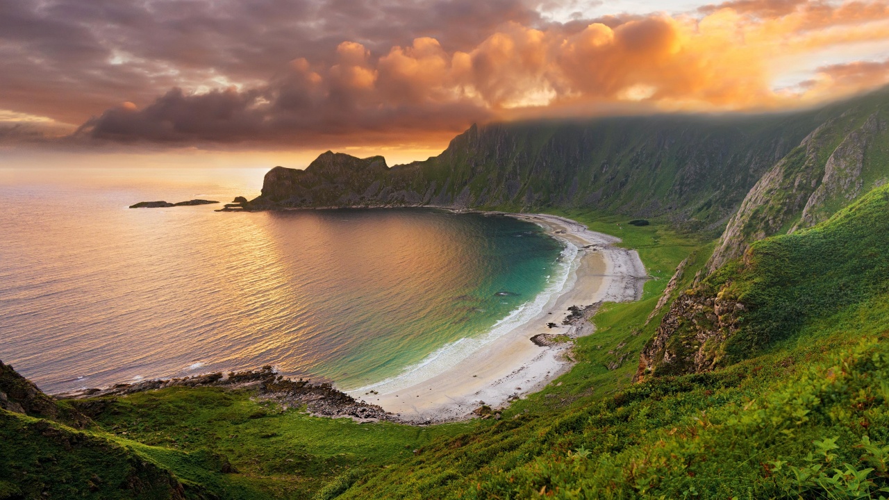 自然、大海、海湾、夕阳、天空、云、山脉、岛屿