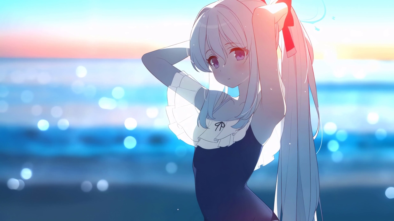 夕阳下的动漫女孩与鲸鱼