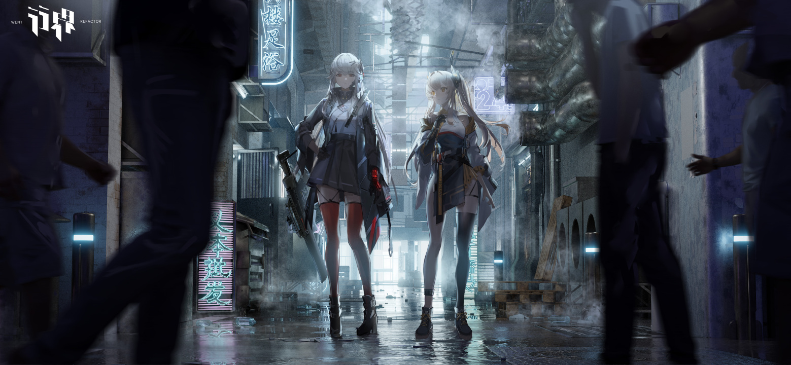 女孩、长发、动漫、动漫女孩、枪、手套、双胞胎、霓虹灯、标志、城市、赛博朋克、游戏