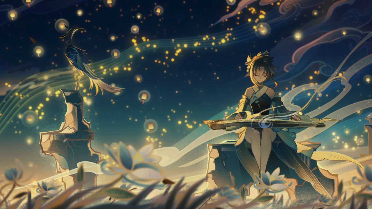 中国服装、灯笼、元宵节、天空、鹤、鸟、花朵、中国古筝、乐器
