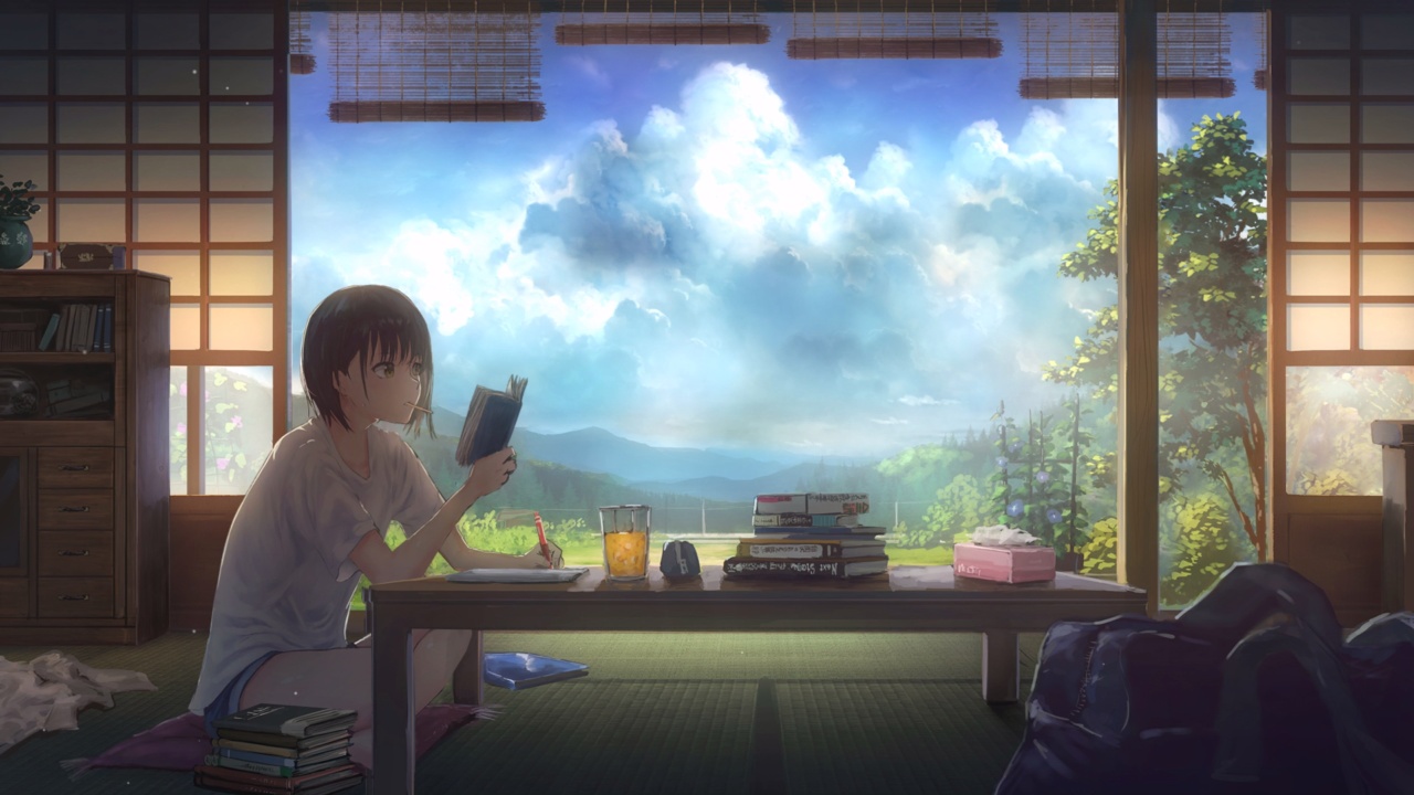 动漫风格窗边书桌场景