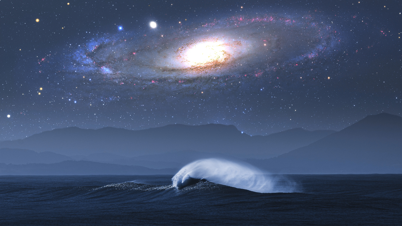 太空、仙女座、星星、天空、夜晚、山脉、夜景、风景、波浪、星夜