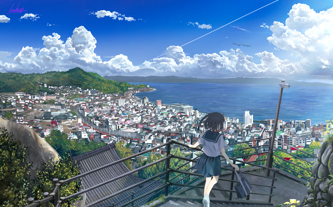 城市景观、动漫女孩、楼梯、裙子