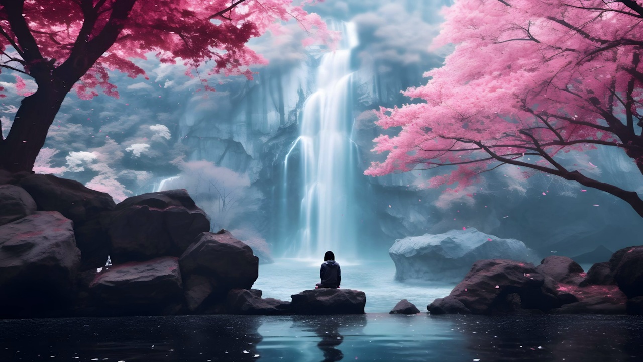 深色头发、长发、坐着、闭着眼睛、双腿交叉、卡通、自然、田野、绿色、男人、冥想、草、AI艺术、成人游泳、卡通网络、武士杰克