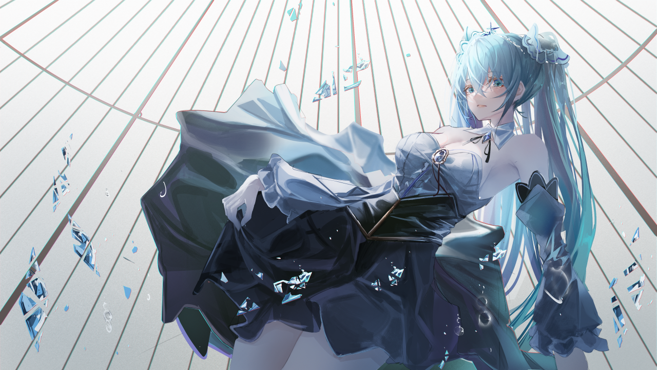闭上眼睛、蓝色头发、长发、水、初音未来、动漫女孩、吉他、空间、明星